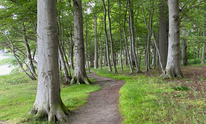 Der Wald am Strand. Karrebækstorp Forrest ist ein Mischwald mit Laub- und Nadelbäumen. Die ausgeschilderte Route folgt der Schotterstraße durch den Wald, es ist aber auch möglich, direkt am Strand zu laufen.
